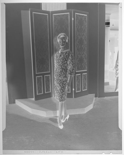 Editor: This silver gelatin print by Martin Schweig pictures a woman with a bouquet in a fancy dress. The inverted coloring makes it look ghostly. What do you see in the composition that stands out? Curator: The interplay of textures and forms is quite compelling. Note how the rigid geometry of the window contrasts with the curvilinear design of the sofa and the organic forms of the floral arrangements. Editor: It's like the inside and outside are reflected in shapes and patterns. Thanks! Curator: Indeed, and the inverted tones serve to heighten these visual contrasts. I’m glad you observed that.