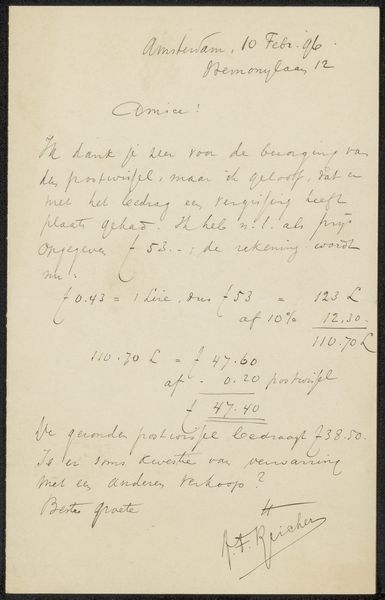 This is a letter from Floris Verster to Philip Zilcken, written in 1890. It gives us a glimpse into the financial realities of the art world at the time. Verster discusses sending work to the United States, specifically New York, for an exhibition. The bulk of the letter itemizes prices for his artworks in dollars. The letter reveals the economic transactions that underpin artistic exchange, the negotiation of value, and the artist's reliance on institutional structures like exhibitions to make a living. Consider the Rijksmuseum's role in preserving this document, turning private correspondence into a public object. What does it mean when a letter detailing the economics of art becomes itself a valued artwork? To delve deeper, one might research the art market of the late 19th century, exhibition practices, and the biographies of both Verster and Zilcken. This letter reminds us that art history is as much about money and institutions as it is about aesthetics.