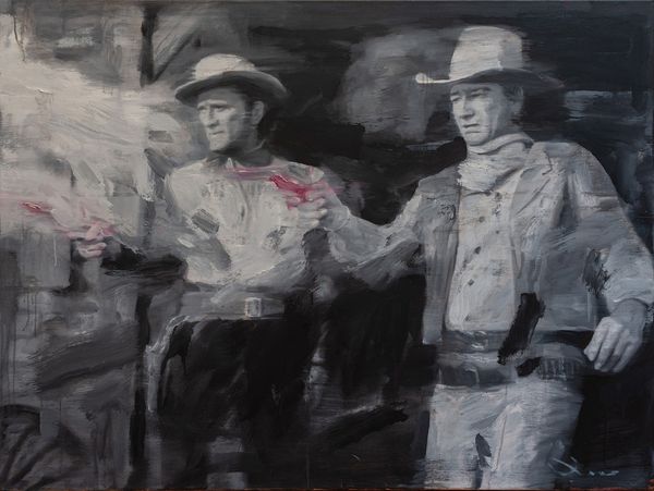 Curator: Here we have Felice House’s striking oil on canvas from 2013, titled "Julia Dean in 'Giant'". Editor: Oh, I like this a lot! It’s got this moody, almost cinematic feel to it. She’s lounging like she owns the world—and that house in the background! Is that supposed to be the set of "Giant", the film? It looks haunting, doesn’t it? Curator: It is indeed meant to invoke the movie “Giant.” The entire series riffs on film stills from classic Westerns, replacing male actors with female ones. House subtly interrogates historical narratives of gender and power through these recast portraits. Editor: Clever. She completely flips the script—literally! The house almost feels like a prop, and I love the way it contrasts with her relaxed pose. But those red boots? They demand attention! They're kind of rebellious, like she’s ready to kick down some doors. Or maybe just put her feet up wherever she pleases. Curator: Exactly. Those details are meticulously chosen. Beyond pure aesthetics, these works prompt conversation around underrepresentation, prompting consideration of women’s overlooked contributions within film history and within contemporary power structures generally. Editor: I totally get that. It's not just about swapping faces; it’s about changing the entire dynamic. Giving women a starring role where they get to call the shots—even if it's just in a painting. There's an assertive stillness in the portrait. The boots, the outfit… it speaks to someone carving their own place, against old-fashioned buildings and ideologies. It all makes it really powerful. I bet Julia Dean would have been the real giant if she was calling the shots! Curator: The piece also engages the history of portraiture and challenges conventions in relation to representation. The pose and setting reference classical tropes. The image complicates and reimagines traditional displays of gender, celebrity, and class, through both appropriation and intervention. Editor: It is truly evocative, a thought-provoking statement about agency and legacy, cleverly embedded within a familiar and striking format. And honestly, makes me want a pair of red cowboy boots... Curator: Absolutely, its genius lies in its subtlety and clever subversion of expectations, so it has really given us something to talk about today.