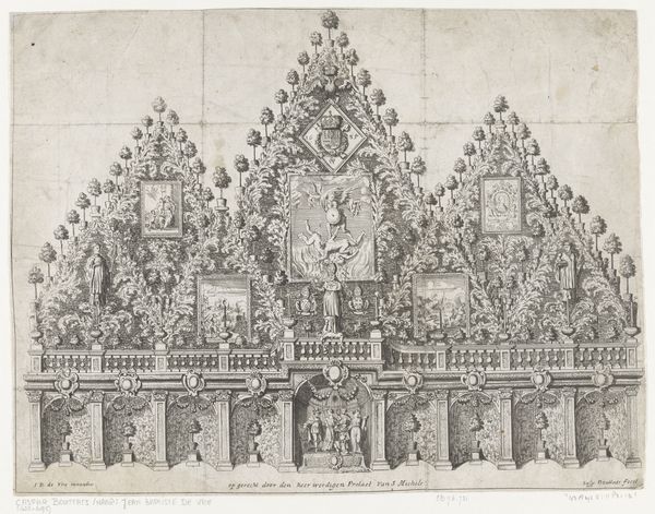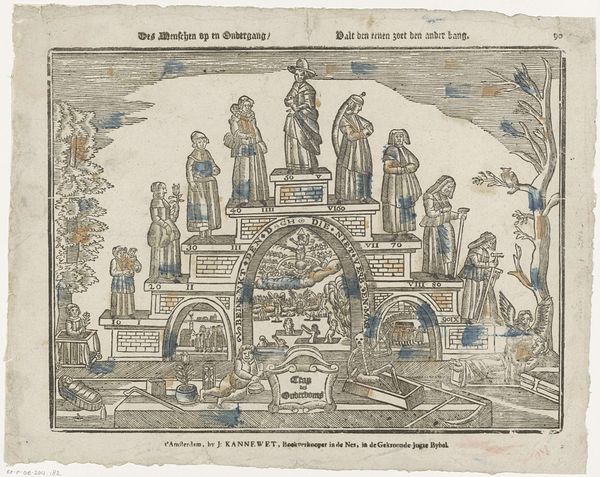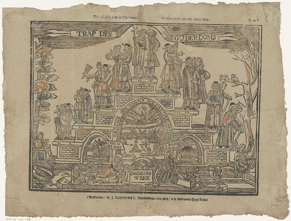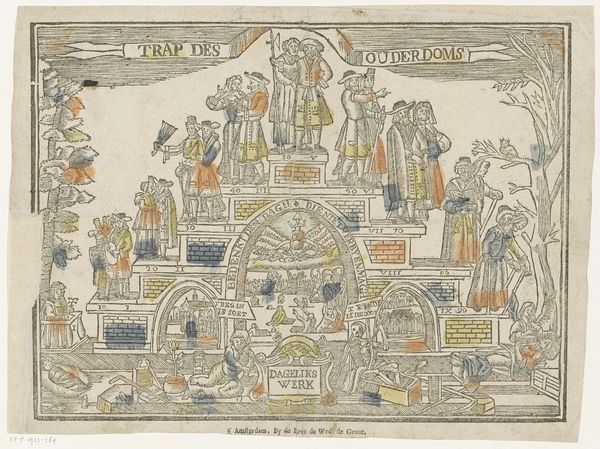 This print, Trap des Ouderdoms or "Stairway of Old Age", was made by the widow Jeronimus Ratelband. It's an etching, created by incising lines into a metal plate, applying ink, and transferring that to paper. The image is a meditation on the stages of life. Look closely, and you'll see the progression of a woman through childhood, adulthood, and old age, ending with death. The use of printmaking allowed for relatively quick production and wide distribution. Prints like this were often sold as inexpensive moral lessons for the home. The simple, clear lines and the addition of some color highlight the key stages and symbols of life's journey. This piece reflects a world where images were not as readily available as today. The labor-intensive etching process contrasts with our digital age of instant replication, reminding us of the value placed on handmade images.