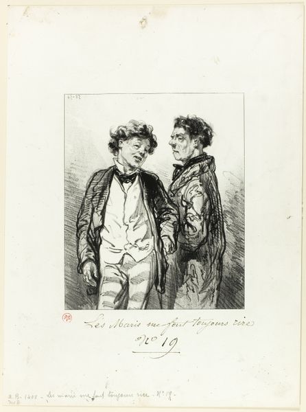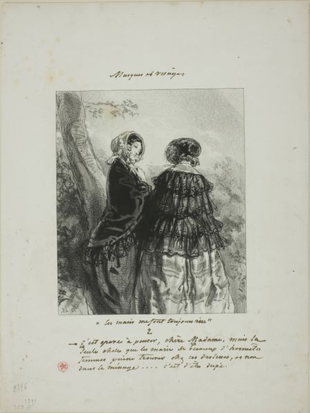 Paul Gavarni made this print, "Husbands Always Make Me Laugh: My husband's latest passion," in France in the mid-19th century. It captures a seemingly innocuous moment of domesticity. Two women, fashionable for their time, are depicted, perhaps engaged in conversation or shared amusement. But what does it mean to represent women within the confines of marriage and domestic life? Gavarni was a keen observer of Parisian society, and his works often reflect the changing social dynamics of the time. The title itself suggests a certain irony or critique of marital expectations. Is Gavarni commenting on the limited roles available to women? To understand this work fully, we might delve into French social history, exploring the legal and cultural constraints placed on women, and we could examine the emerging feminist discourses of the era. By understanding the social context, we can appreciate the image not merely as a record of fashion or manners, but as a subtle commentary on the social structures of its time.