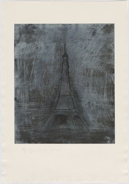 Curator: Right, Rudy Pozzatti's 1958 etching, "Tower of Babel." Quite brooding, wouldn't you say? It's all dark lines converging into this…monolithic form. Like a suppressed scream. Editor: It feels unfinished somehow, or maybe decayed? Like we are seeing something crumbling. I wonder, what's your take on this depiction, and how it echoes the biblical story? Curator: Well, think about the ambition baked into that story. The audacity of trying to reach the heavens! Pozzatti captures that perfectly, but twists it. Look at the lines, that frenetic energy – it’s less about building and more about this internal turmoil, the ego cracking. Doesn't it feel…dangerous? Like something might explode from within the image? Editor: Absolutely! It’s not a celebratory tower. More like a…warning. Is that a reflection of the time it was created? The late 50s felt pretty anxious. Curator: Precisely. Pozzatti isn’t just illustrating a Bible story. He's excavating something raw, something universal about the human condition. He sees that urge for progress and creation colliding head-on with, well, our limitations. How does that strike you? Editor: It makes me rethink ambition. It’s like the image asks: what are we building, and at what cost? Curator: Exactly! Art like this, it's a conversation starter across centuries, isn't it? Pozzatti isn’t giving us answers, but giving us better questions.