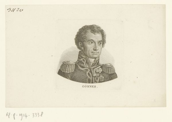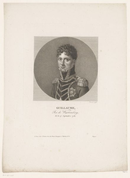 This is Johann Friedrich Bolt’s rendering of Willem I, King of Württemberg. Executed in ink, it’s a study in contrasts, both visual and symbolic, confined within an octagonal frame. Notice how Bolt uses intricate line work to define Willem's features. His gaze is direct and unwavering, conveying authority. The ornate military attire, rendered with meticulous detail, speaks of power and status. Yet, this display is softened by the delicate curls framing his face. The choice of an octagon as the border is intriguing, suggesting a liminal space between the infinite circle and the fixed square. It mirrors the tension between Willem’s personal identity and his public role, individual versus sovereign, all captured through Bolt's careful manipulation of form and line. This creates a dynamic interplay that challenges the static nature of traditional portraiture.