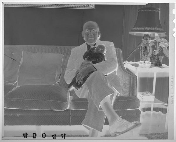 Curator: Peter James Studio's gelatin silver print presents us with an image labeled "Untitled (professor sitting on desk)," currently held at the Harvard Art Museums. Editor: The stark contrast in this negative image really emphasizes the composition's geometry—the desk, windows, and the professor himself create a series of rectangles. It's strangely compelling. Curator: Indeed. The professor's relaxed posture, perched on the desk, suggests a casual authority, perhaps reflecting the changing role of academics in society. The image hints at a transitional period in education. Editor: I'm intrigued by the mirrored image of buildings in the window—juxtaposing the interior world with the outside. It blurs boundaries and adds a layer of complexity. Curator: It reminds us that knowledge is always situated within a larger societal framework, doesn’t it? The professor is both inside and connected to the world beyond. Editor: I see now how the formal elements support that very idea. The artist uses light and shadow to draw us into this duality. It makes you wonder if it was a conscious choice. Curator: It certainly makes for a potent narrative, even in its quiet stillness. Editor: Absolutely. This image has layers that are slowly revealed.
