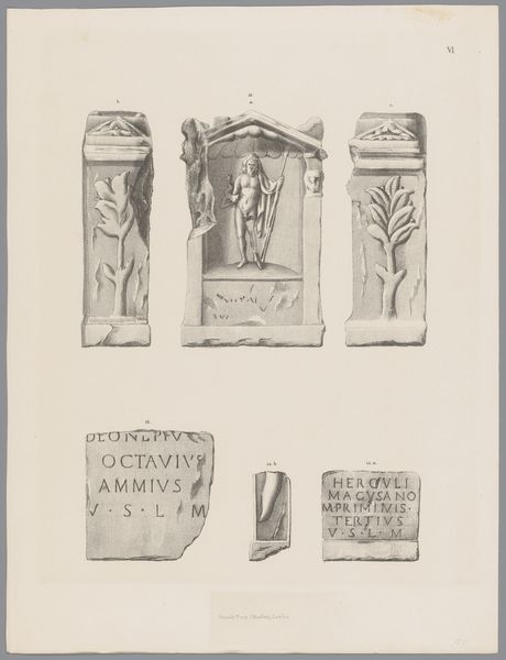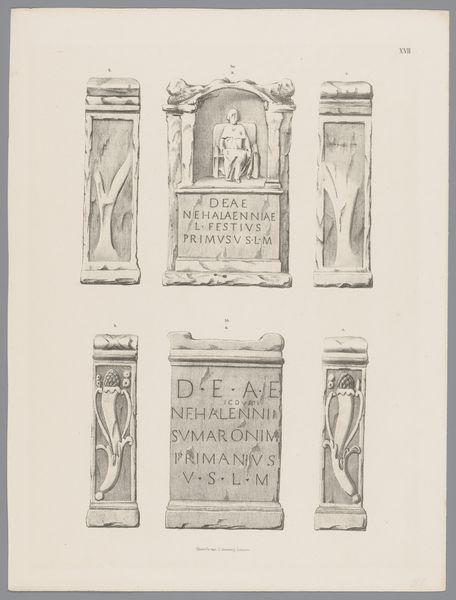 Editor: So, this print from the 1840s by Tiemen Hooiberg depicts "Twee Nehalennia-altaren, pl. XII" – a drawing, and an engraving – that showcase classical realism, academic art, relief, and themes such as form and history painting.. What strikes me is the level of detail he captured. What aspects stand out to you? Curator: What grabs me are the visible signs of manual reproduction: the hatched lines of the engraving, the careful cross-hatching that mimics the texture of stone. Consider how Hooiberg, a draughtsman and printer, mediated our encounter with these altars through labor-intensive means. It speaks to a mid-19th-century obsession with accurately documenting antiquity, a desire to possess and disseminate knowledge through reproducible images. What do you make of the stark contrast between the detailed altars and the rather plain background? Editor: Well, the emptiness does create a sense of isolation. Almost as if we're meant to focus solely on the artifacts themselves. It does call attention to each individual image and begs me to consider it without any surrounding context.. Curator: Precisely. This lack of context is itself revealing. It presents the altars as detached objects of study, devoid of their original ritualistic or communal significance. This presentation also invites consideration about how images were produced and consumed. Who was this print intended for, and what kind of access did they have to Nehalennia's altars themselves? Was this a primary or secondary source for that era? Editor: So, by understanding the materials and methods, we get a sense of the values and limitations of that specific time. It adds layers to the visual experience! Curator: Precisely! Understanding the image's construction informs our own consumption of it. Considering Hooiberg's print in light of labor, materiality, and social context broadens its cultural significance beyond just a mere visual document. Editor: That makes so much sense! I never would have thought about it that way initially, thank you!