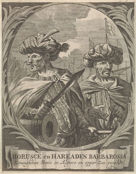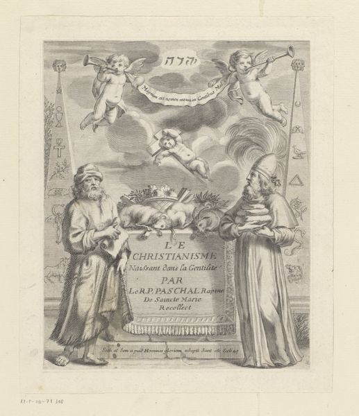 Editor: So, this is “Disputaties van Reinhard Bachow von Echt en Hieronymus Treutler,” an engraving by Frederik Bouttats, dating back to 1653. It’s incredibly detailed for a print! What strikes me is how the artist mixes realism with almost cartoonish figures. What's your take on this piece? Curator: It's fascinating how Bouttats employs visual rhetoric here. Observe the figure on the left holding the scales, a classic symbol of justice. What does it tell you, set against the man weighed down in armor, crowned and brooding? Editor: That's true! He seems to represent secular power, maybe? Curator: Perhaps. But consider the banner overhead, held aloft by angels, proclaiming "DISPUTATIONES." The sword wielded by a winged figure pierces downward, pointing toward Rein Bachov. How do those elements combine? What sort of message are they communicating about faith, about truth, and power? Editor: I see... It is less a simple image of "justice" versus "power," but a commentary of how one seeks validation versus truth...Almost a staged display where Bachov defends faith by confronting hierarchical authority. And does the open book emphasize knowledge? Curator: Precisely! Bouttats employs layers of iconography to construct a narrative. Consider the almost overflowing nature of these figures - do these gestures communicate chaos or harmony? Editor: I see chaos... So, the composition underlines this tension and further emphasizes conflict between knowledge, power and divine authority...It is all incredibly rich and complex. Curator: Yes, and these visual devices were clearly designed to resonate with audiences of the period on various levels – socially, politically, and spiritually. It highlights how artists integrated historical and cultural contexts to embed symbolism within visual languages. Editor: Right! Now I see much more beyond the surface! Thanks, that perspective really unlocks so much!