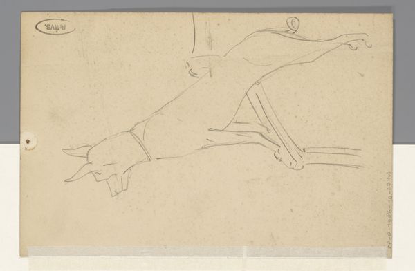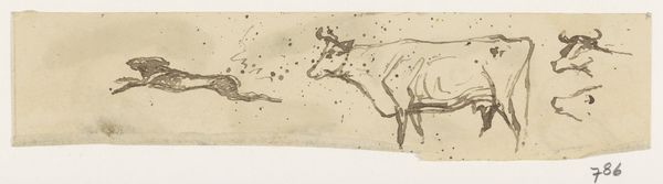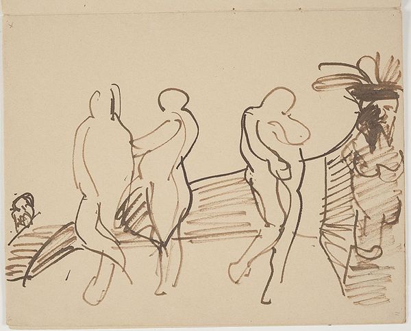 Editor: Here we have "Prehistoric Man, Two Horses, and a Serpent" by Denman Waldo Ross. It’s a simple ink drawing, but the composition is quite striking. What do you make of the use of line in this piece? Curator: Note the economy of line, its decisive character. Observe how Ross articulates form and movement through the variation of line weight and direction. The linear abstraction suggests a certain visual essence. Editor: So, it's less about what the image depicts and more about how those forms are rendered? Curator: Precisely. Consider how the artist's hand, through this medium, distills the subject to its structural core. The negative space becomes as integral as the drawn figures. It informs the rhythmic interplay of the elements. Editor: That's a fascinating way to look at it; I was so caught up in the subject matter! Curator: Indeed, art often transcends its ostensible subject.