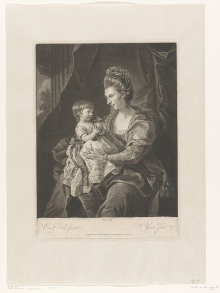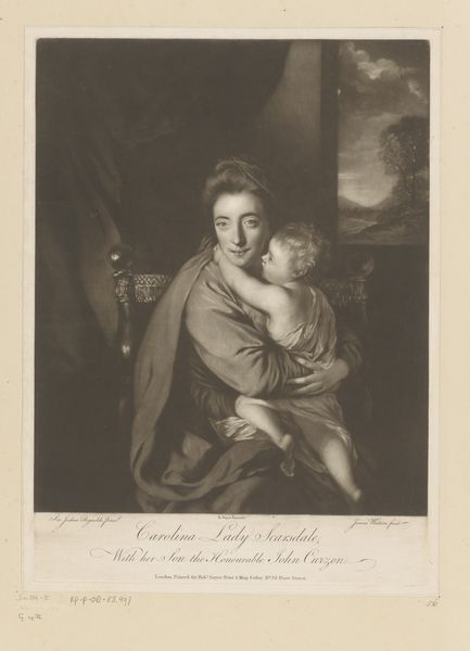 This print of Margaret Georgiana Spencer and her daughter Georgiana was made by James Watson in the late 18th century using a technique called mezzotint. To make a mezzotint, the entire surface of a copper plate is roughened with a tool called a rocker. This creates a solid black tone when printed. The artist then gradually burnishes or scrapes away areas to create lighter tones and highlights. The velvety texture of the mezzotint lends itself well to capturing the soft fabrics and delicate details of the sitters' clothing, like the lace trimming and the intricate folds of the dresses. The laborious process involved would have required considerable skill, and the resulting prints were valued as luxury items. Consider the amount of work involved in creating such a print, and the social context in which it was made. Mezzotints like this allowed for the dissemination of aristocratic imagery, contributing to the construction of celebrity, and connecting to wider issues of class and consumption in the 18th century. By understanding the materials, making, and context, we can fully appreciate the meaning of this print.