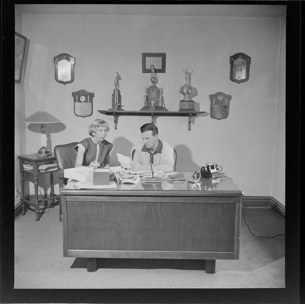 Curator: This photograph by Jack Gould, currently titled "Untitled," captures a meeting of elderly women in hats, seemingly at a DAR, Daughters of the American Revolution, gathering. Editor: There's a formality here, a constructed reality. The hats, the room, even the portrait of Jesus on the wall—it’s all carefully assembled for a purpose. Curator: Absolutely. The materiality of the photograph itself, its small dimensions of 6x6 centimeters, speaks to its role as a possible newsprint image, circulated for mass consumption and participation in civic life. Editor: And look at how the room is arranged. A hierarchy is reinforced through posture and placement. The speaker, standing, contrasted by the seated women. These subtle cues were powerful tools in shaping public perception. Curator: Indeed. Consider the labor involved in attending such meetings, the time invested in the rituals of civic engagement, and the broader social networks it reinforces. Editor: It speaks volumes about belonging, about the forces that shape community and identity. I find the visual layering and the contrast between public image and private space endlessly fascinating.