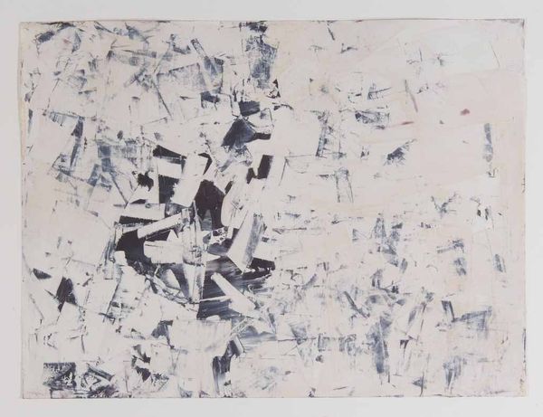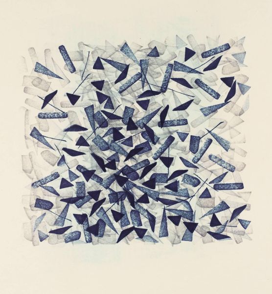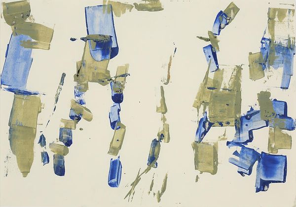 Editor: This watercolor work, titled "Untitled (After Nature: Landscape)" was created in 1962 by Charlotte Posenenske. Looking at the brushstrokes and the layering of blues and browns, it feels very gestural and process-oriented to me. What's your perspective on this piece? Curator: Considering Posenenske’s later embrace of industrial materials and mass production, this early watercolor provides a fascinating insight into her artistic development. Look at how she uses a typically ‘high art’ medium – watercolor – but seemingly without striving for traditional aesthetic beauty. The gestural marks feel almost like notations or instructions. Do you think the “landscape” in the title is merely descriptive? Editor: I initially thought it was referencing the landscape genre. But your comment makes me think, perhaps it's less about representation and more about the labor involved in creating any image, natural or constructed. Curator: Exactly. Posenenske engages with materiality and challenges hierarchical assumptions within the art world. She is playing with the landscape tradition while subtly undermining the notion of unique artistic genius by what seems a more mechanical production than inspired expression. What do you think about the repetition of forms in relation to factory processes? Editor: I hadn't considered the repetition, but now that you mention it, the similar shapes do seem almost modular. It's interesting how that tension is already present here, even before she moves into her more overtly industrial work. Curator: This piece reveals the beginnings of Posenenske's radical move away from traditional art-making. It reveals how, for her, process and material inquiry became intrinsically linked to a wider critique of the commodification and distribution of art itself. Editor: It's amazing how much this watercolor reveals about Posenenske's future artistic path. I will definitely consider the materials and production process as the subject of the artwork now.