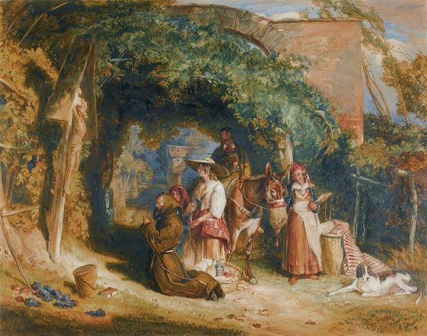 Editor: This is Witherington's "Going to School," held at the Tate. It's a small work, and feels so personal, like a glimpse into a memory. What strikes you when you look at it? Curator: The intimacy, definitely. It's not just the size, but the way he captures that tender moment of childhood reluctance. The older girl, perhaps a sister, carries the weight of responsibility, while the younger one seems lost in her own little world. Editor: It's interesting how he uses the browns and greens to create a sense of enclosure. It really does feel like a secret world. Curator: Exactly! And that little red petticoat adds such a beautiful pop of colour. It grounds the image in reality, while the overall haziness gives it a dreamlike quality. It's as if we're seeing this scene through the eyes of someone who remembers it fondly, but perhaps not entirely accurately. Editor: It's almost like a faded photograph! I love how it evokes such strong emotion through such simple means. Curator: Me too. It reminds us that art doesn't need to be grand to be deeply moving.