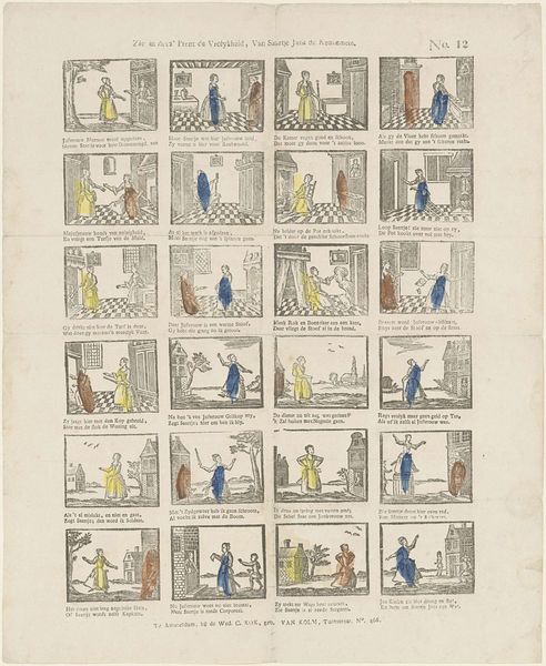 This undated print, "Urbanus en Isabel", by weduwe C. Kok-van Kolm, presents a sequential narrative using lithography. The work is structured into a grid of small scenes, each illustrating a moment in the story of Urbanus and Isabel. The limited use of color—yellow, red, and blue—highlights specific figures and elements, drawing the viewer's eye through the narrative. Notice how the artist uses line and form to create depth and movement within each framed vignette, despite the static nature of printmaking. The sequential arrangement invites a semiotic reading, where each image acts as a signifier in a larger chain of meaning. This structure echoes the format of comic strips, using visual codes to convey a narrative about relationships and societal expectations. The artist effectively challenges fixed meanings by presenting a fragmented, episodic view of life. The print serves as a fascinating example of how formal structure can be used to convey narrative and social commentary.