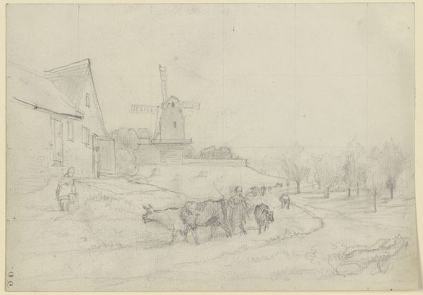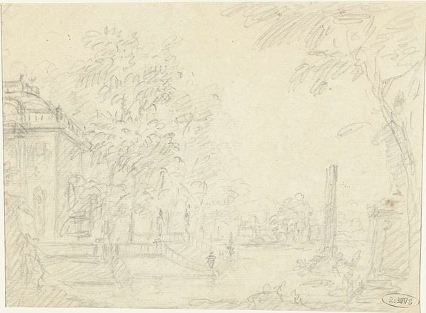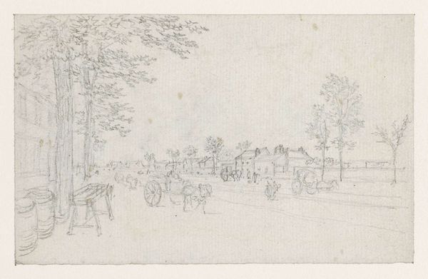 Curator: So here we have Georges Michel's "Postkoets bij een hek tussen twee gebouwen," a pencil drawing likely created sometime between 1773 and 1843. Editor: It's… faint. Kind of a ghostly suggestion of a scene, like a memory. What strikes me is how rudimentary it looks, almost like just the bare bones of the architecture and figures. How should we understand something like this? Curator: Consider the physical making of the drawing, its apparent roughness, and the societal context it reveals. Pencil wasn't always so cheap and plentiful; think of the material accessibility here. The hasty linework, the lack of precise detailing—suggest not an aesthetic choice but a commentary on artistic labor. Michel seems more focused on capturing a moment, documenting the world, rather than crafting a polished "masterpiece." What does the presence of the stagecoach itself tell us about modes of production? Editor: I guess I hadn’t considered it that way. So, rather than judging it for being ‘unfinished,’ you’re suggesting its value lies in its unvarnished look at the realities of the time and artistic practices? What would he have wanted us to focus on by drawing a stagecoach specifically, do you think? Curator: Exactly! The stagecoach signifies both commerce and social interaction, which allows us to interrogate social classes and access to travel. Michel might have chosen this commonplace subject to highlight the everyday life of those who worked with this type of transportation. This work challenges us to see art not just as beauty, but as a form of documentation shaped by the availability of resources. Editor: I see! So, looking at art this way provides insight into the labour of artistic creation and the socio-economic realities of Michel’s time. I never really looked at art with that kind of historical and materials focus. It opens up new areas for understanding and interpretation. Thanks! Curator: Precisely. And the beauty of art is it offers itself up as material culture, if you approach it that way.