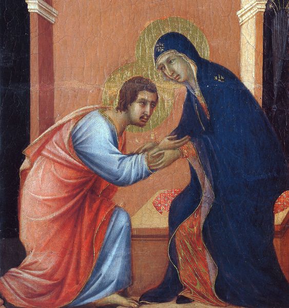 Editor: Here we have Duccio’s "Crucifixion (Fragment)," made with tempera around 1311. There's a real sense of sorrow emanating from the faces; everyone seems connected yet isolated in their grief. What compositional elements strike you most in this fragment? Curator: Note the arrangement of figures. They're compressed into the pictorial space, aren't they? See how Duccio manipulates color – the intense reds against the somber blues and greens – to create a visual hierarchy and emotional resonance. The figures are carefully positioned and draped to contribute to an internal rhythm. Editor: So, the colors aren't just decorative but serve a specific function? Curator: Precisely. And look at the line work – sharp and defined, creating clear separation. Consider too, how the halos operate within the piece. They’re not simply symbols of divinity but are tangible forms that interact with the space. Does the artist employ innovative visual tactics, or conform with standard practice? Editor: I hadn't considered the halos as part of the composition itself. The piece’s use of emotion-conveying colour in what's meant to be such a symbolically spiritual space is intriguing. Curator: Indeed. By looking at the interrelations between the depicted elements, we can understand how meaning is constructed and perceived. So many compositional elements are here merely for their aesthetic function. Editor: I'll definitely look at the piece with this new perspective on form. Curator: Excellent. Every aspect contributes to the overall aesthetic and communicative power of the artwork.