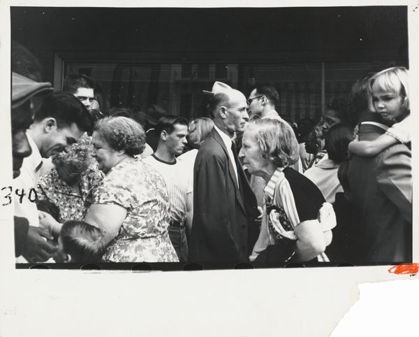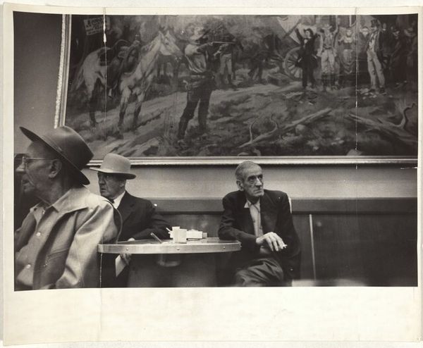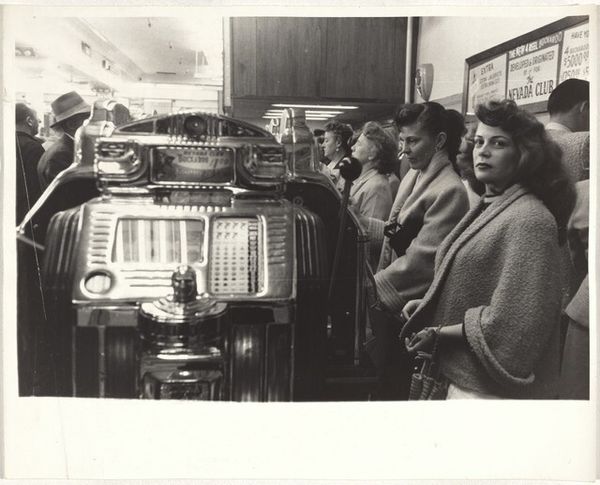 Curator: This gelatin silver print is titled "Gambling--Reno, Nevada" by Robert Frank, dated 1956. My immediate impression is one of subdued anxiety—a group fixated on something above, a mixture of hope and nervous energy palpable in the scene. Editor: Indeed. The upward gaze unifies the composition, directing our attention to the unseen mechanism of chance above. The figures are cropped, drawing visual emphasis to their activity of hopeful expectation as active subjects in their reality. The monochrome flattens the space. Curator: Precisely, that flattened space emphasizes the graphic quality. The scoreboard, a brutal geometric form, dominates, doesn't it? It’s a kind of modernist cathedral, an icon of consumer hope and simultaneous alienation. The figures themselves, framed from a lower vantage, appear compressed and subordinate to the architecture of chance. Editor: I read that scoreboard differently. Yes, it's geometric, but the flashing numbers recall early digital displays. The image overall becomes an omen to modern obsessions – gaming and technology’s infiltration of desire and perhaps social reality. They seem spellbound, trapped. Each figure's posture reveals that quiet surrender, particularly poignant because it's linked to community rituals of collective belief and economic dreams. The cigarette and cigar, also, hint at ritual. Curator: Intriguing. I find the use of tonality in the photograph striking; it offers so many tonal possibilities for different grays to be captured by the medium of photography. Note, also, Frank's strategic depth of field compresses this read. Do we focus on individual hopes, or their collective nature, as a commentary on societal dynamics? Editor: It's about more than economic striving. The image whispers of existential seeking, not monetary gains, and anxieties. Curator: It brings into stark relief these interwoven themes. How people invest hope, meaning, perhaps a deeper sense of being in mundane structures of random numbers in a space where time might feel unreal as long as one remains. It is hard to extract hope from these surroundings captured. Editor: I'd argue Frank masterfully exposed this subtle pursuit through symbolism—gambling’s iconography is ancient. Thank you for sharing this reading. Curator: And thank you, I think the architecture of desire needs this perspective of iconographic context and weight.