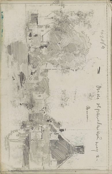 Curator: We are looking at "Emmerik aan de Rijn," a pencil drawing on paper crafted by Johannes Tavenraat between 1863 and 1866. Editor: It has a lightness to it, a gentle quietness. It feels like a memory, faint and delicate, or perhaps an idea just taking shape on the page. Curator: The cityscape depicted captures Emmerich on the Rhine. Consider that the Romantic movement was ebbing as this work was produced, while currents of Realism gained momentum. This piece almost seems caught in the transition. I wonder how that impacted its reception? Editor: The river, snaking through the composition, serves as a visual thread. Rivers often carry the symbolism of the passage of time, a continuous flow connecting different points in history and culture. Notice the almost ethereal treatment of the buildings, rendered with such spare strokes. Curator: The choice to represent the town in such a way may be understood in terms of class and the artistic milieu of the time. Given that Tavenraat focused predominantly on landscapes, could his rendering represent the erasure of social differences via focusing primarily on landscape? Editor: Interesting point. I also notice a distinct lack of human figures dominating the view, lending credence to that notion. Instead, it is nature and its imposing scale against the smaller buildings that grabs us here. Curator: This aligns, too, with Tavenraat's position in his cultural environment, where art became less concerned with portraying nobility and royalty. I also wonder if there were social disruptions or political undercurrents during this time that impacted him? Editor: Perhaps a retreat into nature offered solace, visually stripping away social conflicts from a fraught political reality and directing the viewer toward idealized themes. Looking closely, though, these swift strokes hold their own truth. Curator: True, seeing these elements as an expression of social shifts helps to amplify our experience. Editor: The quiet symbolic resonance lingers long after the initial glance. It provokes an unexpectedly thoughtful journey.
