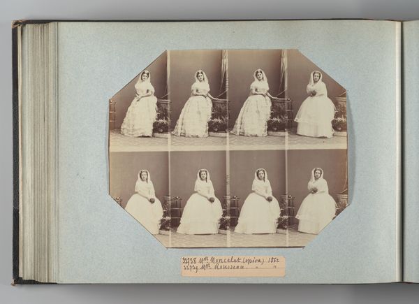Curator: This is "Mlle Rousseau; Mlle Mercier," a photograph made around 1864 by André-Adolphe-Eugène Disdéri, currently residing here at the Met. What strikes you most when you first look at it? Editor: The repetition! It's like a silent film reel, stuck on pause. A poignant echo of a lost moment. I wonder about the nature of portraiture and time. Does photography stop or elongate a moment? Curator: Indeed. Disdéri was known for his carte-de-visite photographs, small and inexpensive portraits. These were incredibly popular. The mass production is the key element to discuss when reflecting on the role that the democratization of art has in contemporary artistic thinking. This image really plays with this form, doesn't it? Editor: Mass production of portraits… it takes away from the uniqueness that has long been one of art's selling points. So is it then the industrial era challenging the art establishment in this picture? Curator: Precisely. Think about the materials: a relatively simple chemical process printed onto paper, and also the staging for eight similar poses—all intended for widespread distribution and consumption, and how they intersect with concepts of authorship and value. Editor: It seems rather ironic that those opera singers posed very precisely in all those photos but now looking at those "repeats" the impression is less serious but more fragile…almost dream-like... Did Disdéri plan that "dreamy" effect? Or were his clients concerned more with representation and self-image in that particular age? Curator: These portraits capture the aspirations of a burgeoning middle class. These images weren't just about documenting likeness; they were about signaling status. Think of the dresses; you can also tell a lot from the chair they sit in, what poses were chosen and preferred, and by the number of photos created from a single visit. It changed the art market forever. Editor: Almost a premonition of the Warhol's Marilyn prints and multiples... Fascinating to contemplate how a simple portrait could hint at shifts in power dynamics and consumption models through time. A great case study for any aspiring materialist! Curator: Absolutely! It reminds us that art doesn't exist in a vacuum.