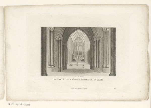 Curator: What strikes me first is the stark grandeur—the almost intimidating verticality emphasized by the use of line and shadow. Editor: You're looking at "Toegangsportaal van de Kathedraal van Chartres," a print by Sigismond Himely created before 1841. This engraving captures the entrance portal of the Chartres Cathedral. Considering its historical context, this work would have reached a broad audience through print media. Curator: Broad audience indeed. Even rendered in black and white, the architectural detail is astonishing. Look at the precise delineation of the sculptures flanking the doors. There’s a real depth created using line. Editor: Right, Himely is meticulously documenting not only the architecture but also its cultural significance. The cathedral wasn’t merely a religious structure; it was a symbol of civic pride and societal structure. Prints like this would serve as historical documents, cementing that identity and allowing it to travel. Curator: Absolutely. And observe how the light interacts with the stone, casting dramatic shadows that heighten the solemnity. The figures in the doorway give a sense of scale and further emphasize the cathedral's imposing presence. The repetition of vertical lines draws the eye upward, creating a feeling of aspiration, that desire for transcendence so integral to the Gothic aesthetic. Editor: I agree, the Gothic aspiration is strong here, especially as it echoes within political symbolism. Chartres wasn't simply a church; its imagery played a role in establishing the dominance of royal ideology during that period. Images of gothic buildings spread through art, which worked to build pride in a burgeoning, if highly theocratic, nation-state. Curator: It’s fascinating how this image, absent of color, can convey such textural richness. You can almost feel the rough texture of the stone, see it weathered by time and history. I'm thinking about light and shadow here: The composition invites contemplation and is achieved through these tonal variations. Editor: Seeing the portal this way reminds me of how places define historical periods and our shared ideals. Printmaking made these accessible, thus building the narrative. Curator: I agree entirely. I think I have a richer appreciation now, having thought about how it made these iconic gothic buildings widely known and a source of emerging national identities.