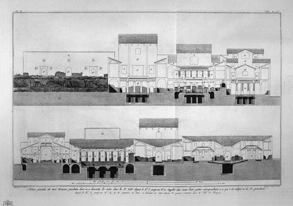 This is Giovanni Battista Piranesi's "Second floor plan of the three-story house," made sometime in the 18th century. It's an etching, a printmaking process where lines are incised into a metal plate, inked, and then pressed onto paper. Piranesi was not just an artist, but also an antiquarian, deeply interested in the material culture of ancient Rome. This print exemplifies his fascination with architectural structures. The act of meticulously drafting and etching these plans speaks to a culture of documentation, typical of the Enlightenment. Etchings like this one circulated widely, helping to shape the architectural imagination of the period. Consider the labor involved - the precise drawing, the acid-etching, the inking, and printing - all reflecting a pre-industrial mode of production. It’s a handcrafted approach, a far cry from today’s digital rendering. So, while the image itself depicts ancient architecture, the print reveals a great deal about 18th-century modes of production, the value placed on classical knowledge, and the meticulous craft involved in disseminating that knowledge.