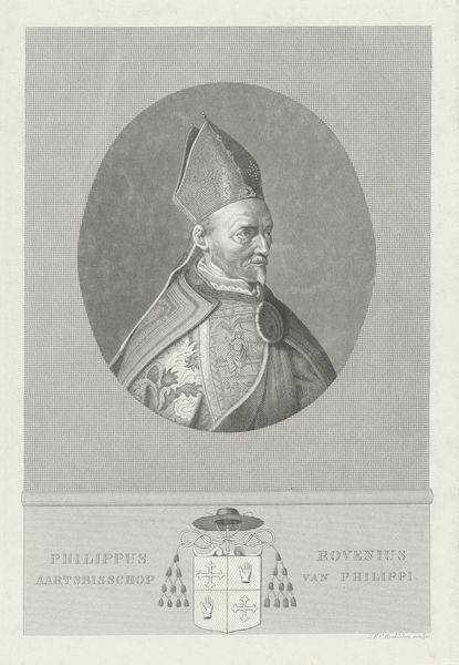 Editor: Here we have a print from between 1800 and 1802, “Portrait of Pope Pius VII”, by Jan Gerritsz. Visser. It's quite detailed. The crosshatching creates a texture behind the figure that makes him pop out. I wonder, what do you notice first when you look at this portrait? Curator: I am immediately drawn to the compositional balance. The figure occupies the central space, with his hand raised in a gesture of benediction, creating a strong vertical axis. This is elegantly counterpointed by the horizontal emphasis of his papal robes, laden with intricate patterns. It’s a study in contrasts between the active and passive, wouldn’t you say? Editor: That’s a good point about the robe. Do you think its detailing is too busy, competing for attention with the Pope’s face? Curator: One must consider that in formal portraiture, detail is not merely ornamentation, but a symbolic language. The complex embroidery speaks to the authority and status of the subject. Observe, too, how the play of light and shadow across the engraving gives form and depth, emphasizing the texture of the clothing. This chiaroscuro is central to understanding the visual impact. Editor: I see what you mean about the symbolic weight now. Looking at the details really adds depth. Thanks for pointing that out! Curator: Precisely. By focusing on formal elements, one gains a deeper understanding of the intended message and its aesthetic realization.