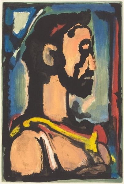 Curator: The painting before us is titled "L'Quais," created by Georges Rouault in 1937, employing tempera on paper. Editor: My first impression? Restrained intensity. The colours are saturated yet limited, almost like a carefully curated memory. Curator: Indeed. Rouault often explored the themes of injustice and suffering. In order to address those challenges, the identity of figures like these needs unpacking: this person on the docks—is a worker or perhaps someone marginalized by society during the interwar years. There is a palpable sense of vulnerability communicated in his style, a commentary, if you will, on social conditions. Editor: And the stylistic rendering enhances that. See how the thick black lines encircle the shapes. The technique recalls stained glass, and gives the painting an air of almost tragic dignity, turning what could have been brutal, ordinary life into something close to martyrdom. Is there any precedent in his previous portraits? Curator: Absolutely. Rouault's earlier works were of clowns and prostitutes, subjects seen as outsiders, similar to this figure on the docks, which aligns perfectly with your perception of almost iconic or martyred dignity. He elevates his subjects by visually connecting them to powerful archetypes. And remember, expressionism aimed to reflect inner turmoil... Editor: The eyes in particular... there seems like very few details on the head. I almost detect tears within them or the lack of eyes may imply loss or displacement—all fitting symbols within that artistic, social narrative. Curator: Precisely. This painting offers an avenue for discussions on class, identity and resilience. Editor: Looking again at how these symbolic dimensions are composed, I am again fascinated by the strength of colour, the interplay between opacity and the translucent glow – how art reveals hidden truths and continuities. Curator: A powerful testament, ultimately, to the enduring human spirit against adversity.