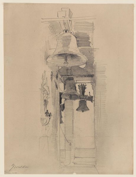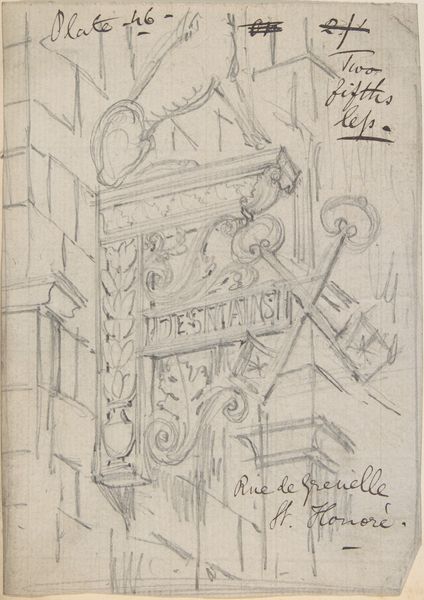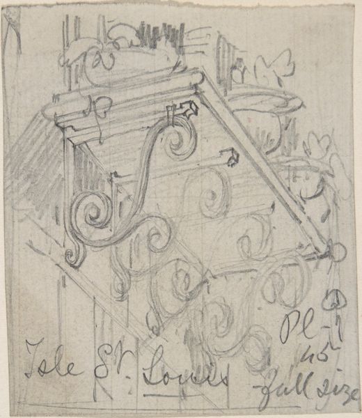 Curator: At first glance, it feels like a forgotten relic, rendered with delicate pencil strokes...almost spectral. Editor: Today we are exploring “Metal Cover (to a Downspout?), Hopital St. Louis,” a graphite and pencil drawing created sometime between 1875 and 1885 by Richardson Ellson & Co. It currently resides here at the Metropolitan Museum of Art. I find myself immediately drawn to its provisional quality; it feels less like a finished piece and more like an architectural musing. Curator: The architectural detail – the downspout cover itself – speaks volumes. It's not merely functional; it’s ornamented. Look at the swirls and flourishes – they suggest a social stratum invested in aesthetics, even in the most utilitarian aspects of civic life. Hospitals are also complicated spaces to discuss. They offer much needed help for often extremely marginalized communities but are not inherently altruistic due to religious and historical regulation. Editor: Absolutely, and the symbol of the downspout is rather evocative. Consider its function: channeling water, a vital element, but also potentially destructive. In terms of iconography, it is a protector, and also representative of civil engineering which often works toward making people less vulnerable to weather catastrophes and potential plagues that impact everyday people's safety. The architectural flourishes denote not only affluence but social duty. Curator: I see the intersectionality there, the hospital as a space both caring and exclusionary, symbolized by an object mediating between necessity and extravagance. This piece pushes us to consider structures, both literal and figurative, which define how we assign belonging and deserving in the late 19th century. Editor: It is that tension—between mere survival and elaborate care – that feels compelling, revealing society’s intertwined priorities through the lens of architectural detail. It speaks to more than just Realism or Academic art, and more so touches on visual continuity. Curator: Precisely. It reminds us that even seemingly mundane urban objects embody a complex matrix of societal values and disparities that reverberate across time and communities. Editor: It leaves me thinking about how something designed for such a simple purpose can become a silent carrier of social and historical weight, constantly transforming depending on who is looking.