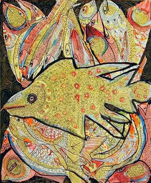 Paul Klee made this painting, called 'The Goldfish', at an unknown date, and he did it with oil and watercolor. The dark ground really sets off the jewel like tones of the fish, doesn't it? I love the way Klee uses color and line to create such a sense of depth, but then flattens the picture out again! Look closely, and you’ll see little, almost scribbled marks and floating lines that give the impression of underwater plants and rippling water. The paint is applied thinly, like watercolor washes, and is very transparent, with lots of layering. See how the colours seem to glow from within? I love this kind of colour, it reminds me of Matisse, or Bonnard. All these artists were very influential for me as I was finding my own painting practice.