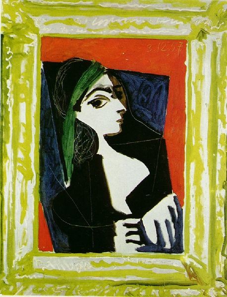 Editor: Here we have Picasso's "Portrait of Marie-Thérèse Walter," painted in 1937 using oil paints. It strikes me how the face is divided—almost fractured—into different colors and perspectives. What visual elements stand out to you, and how do you interpret them? Curator: The painting is certainly a masterclass in Cubist portraiture. Observe how Picasso rejects traditional perspective. He presents us with multiple viewpoints simultaneously. Note the contrasting color palettes bisecting the face: a cool, ethereal blue juxtaposed against a harsher, almost bilious green. What does this color duality evoke for you? Editor: I see a stark contrast! The cool blue side feels serene, while the green seems more troubled. Is he trying to show two sides of her personality, maybe? Curator: Perhaps. Consider also how Picasso flattens the picture plane. He dismantles the illusion of depth, emphasizing the painting's two-dimensional surface. Look closely at the lines. Do they delineate form realistically or serve a different purpose? Editor: The lines are definitely more about defining shapes and planes than creating a realistic image. They seem to almost clash in places, adding to the disjointed feel. Curator: Precisely. This dissonance is key to understanding Picasso's project. He aimed not to replicate reality, but to explore its underlying structures, its fragmented nature. Through color, line, and form, he deconstructs and reassembles the figure, compelling us to see beyond surface appearances. Editor: That's fascinating! So it's less about the individual and more about the artist experimenting with form and challenging our perceptions. I never thought about it that way before! Curator: Indeed. Through close observation, we can unravel the complexities of Picasso's visual language, revealing the formal strategies that make this portrait such a compelling work of art.
