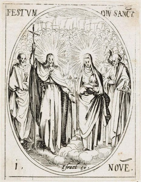 Curator: Here at the Rijksmuseum, we have an intriguing piece from the Italian Renaissance, attributed to Antonio Tempesta and created sometime between 1565 and 1630. It's an engraving titled "H. Attica, H. Constanza en H. Artemia." Editor: The first thing that strikes me is the composition: three veiled figures, tightly framed within an ornate oval. There's a quiet solemnity about them, despite the decorative border. The monochrome intensifies this, it lends gravity to their representation. Curator: Indeed. Let's delve deeper into the social context. These are three saints, likely venerated in a particular region or order, given the specificity of their names, the artist making a direct link between power structures of religious institutions and those that produce art. Their depiction within the visual culture served a specific purpose within the Catholic Church's outreach, likely during the Counter-Reformation period. Editor: I'm curious about the symbolism they hold. Each carries what appear to be floral or botanical emblems. I think this is a commentary of power being manifested in the hand through symbolical ownership of nature as seen throughout renaissance works. We must ask why this is here; their expressions are demure and soft, yet there is something incredibly violent at the same time in this image. Curator: The medium itself—engraving—played a significant role. As a reproductive technique, it allowed for wider dissemination of images. How the Church co-opted art production is on full display. It allowed these archetypes of pious feminine virtue to be accessed and emulated within different class strata. How did such dissemination work and for what class? These are more pertinent questions than an immediate visual analysis. Editor: Fair point. I find myself dwelling on the formal aspects – the delicate line work, creating textures of the garments, each woman existing as if suspended between worlds of humanly form and iconographical ideal, perhaps to transcend those boundaries... Curator: So, what we're uncovering then, as moderns with different ideas is not merely an object of aesthetic or historical curiosity, but rather a historical artifact embedded within power dynamics, isn’t it? A reflection on representation, reception and religion in the post-renaissance world, for a culture and art form that has continued into today, the 21st century. Editor: Exactly. Engaging with this print forces us to reconsider inherited narratives surrounding virtue, faith, and the complex systems that underpin art creation and consumption. It allows us to question art history itself.