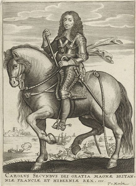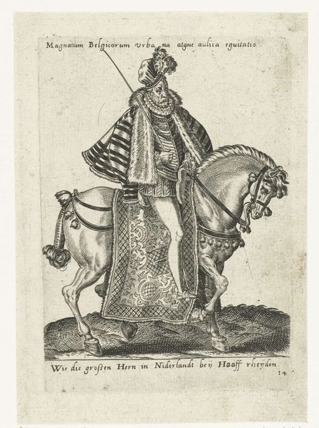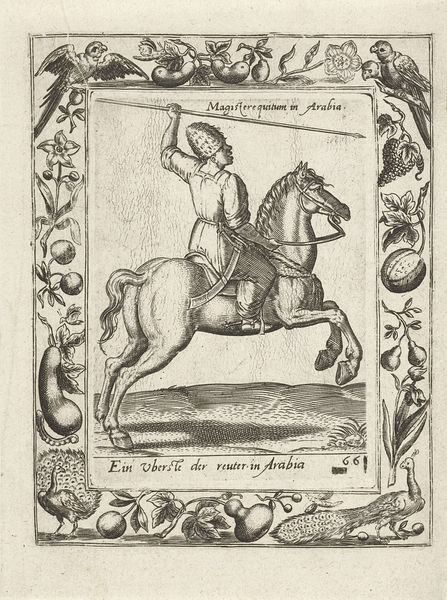 Curator: Abraham de Bruyn created this engraving, "Arabische edelman en zijn vrouw te paard," or "Arab Nobleman and his Wife on Horseback" around 1577. It resides here at the Rijksmuseum. The figures, presented within a very ornate frame, strike me as exceptionally still. Editor: The stark, graphic nature immediately makes me think of the power dynamics at play. The nobleman is placed forward, a symbol of status and dominance, yet the image is rife with the orientalist imaginings of the time. Curator: Indeed. De Bruyn, working in the late Renaissance, was likely less interested in factual representation and more engaged in constructing a visual statement about cultural difference. Consider the attire: The tall headdress on the man, her full covering, meant to signify otherness to European audiences. It perpetuates stereotypes. Editor: Absolutely, and consider the weight of horses as symbols of conquest, trade, and social stratification throughout history. The woman riding behind speaks volumes; where does she fit within the social discourse of the artwork and the represented culture? It almost acts as propaganda through subtly presented symbols. Curator: The artist uses the established symbolic language of portraiture and courtly display to depict people from another culture. There is no engagement with Arab subjectivity. The use of “Arabische” as a descriptor lumps a very diverse region into a monolith for European consumption. Editor: Note the almost illustrative quality, resembling depictions in illuminated manuscripts or early printed books. De Bruyn translates real-world observations through established visual rhetoric, reinforcing preconceived ideas about gender roles and cultural identity through clothing, posture and relative placement. This work operates within, and strengthens, the structures of early modern Europe. Curator: The framing devices further emphasize its status as an exotic specimen observed, and contained, for European viewers. We see the depicted figures mediated, classified, and controlled through representation. Editor: The enduring power of images. It prompts us to consider what purpose these early prints had and continue to have and what narrative functions they serve within collective memory. Curator: Thinking about how images historically portray power is vital. The act of observing carefully always leaves us more critical than when we start. Editor: A potent reminder that these early portrayals built narratives that, sadly, persist even now, in a globalized setting.