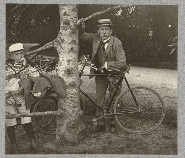 Editor: So, here we have this old photograph called "Fietser en wandelaar schudden elkaar de hand op een weg bij Pontoise," taken around 1897. It's at the Rijksmuseum. I’m immediately struck by how formal the greeting is! A handshake and a doffed hat… What's your read on this scene? Curator: Ah, yes! It whispers of a bygone era, doesn’t it? I see more than just formality, though. To me, it feels almost… theatrical. The backdrop is this almost dreamlike landscape of filtered sepia tones that set an unyielding natural boundary to the encounter. What do you think the landscape tells us? Do you see constraints that inform the exchange? Editor: The constraints remind me of a stage almost, but a public one. They are clearly aware of some social script here. Is it that awareness of script why there's something very poignant, almost humorous, in how seriously they're taking this chance meeting. I suppose nowadays a head nod is more likely. Curator: Precisely! It’s the tension between the intimate gesture – a handshake, an acknowledgement of presence – and the vast, indifferent world around them. This isn’t just realism; it’s realism filtered through a lens of, perhaps, gentle irony. Think about it – photography was still relatively new. There's a self-consciousness about documenting everyday life, isn’t there? They are aware of being perceived. It's charming! It makes me think of silent film and early comedies with their awkward social interactions and hyper formality. Don't you think? Editor: Yeah, like a very still, very quiet, scene from an old movie! I hadn't thought of it like that at all. This piece definitely gives a look into the rituals and constraints, yet also humour and beauty in chance encounter! Curator: It makes you appreciate the small human moments, even those captured through the old, quirky lenses of yesteryear! Art constantly holds up the mirror for us to smile at ourselves in!