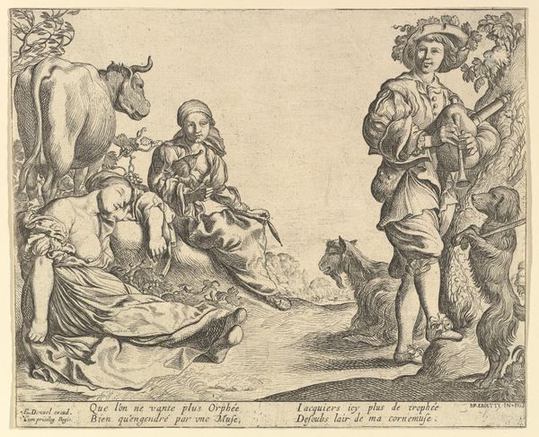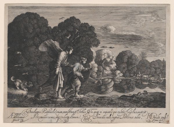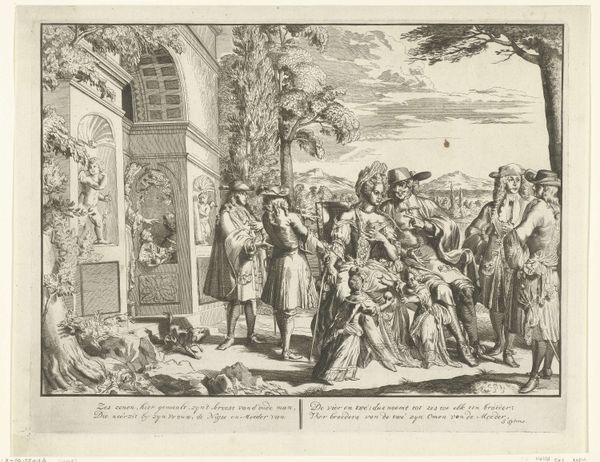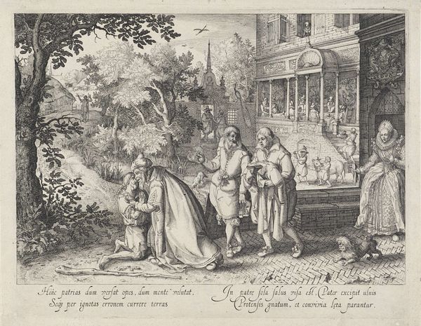 Curator: Here we have Claes Jansz. Visscher's print from 1608, titled "The Prodigal Son Taking Leave of His Father." This etching and engraving visualizes the biblical parable within a rich, early 17th-century context. Editor: My eye is immediately drawn to the stark contrast between the dark architectural facade and the idyllic landscape beyond. It’s like two worlds colliding within a single frame. Curator: Indeed. The architecture represents the structured, orderly world the son is rejecting. We can interpret that the detailed depiction of architecture as a testament to Visscher's skill and the patron's interest in portraying social standing through property. Editor: Note how the line work varies—dense and precise in the architectural elements, looser and more fluid in the landscape. This directs the eye and gives the scene an interesting formal imbalance. Curator: Considering the rise of merchantile class in the 17th century, the story of the Prodigal Son resonated with many families as young men would venture off to Amsterdam or to the colonies in search of financial gain. The artist creates that sentiment with the depiction of lavish figures leaving on horseback. Editor: There is an emotional complexity captured here. I can perceive the tension of familial obligation against the urge for freedom in that moment. It almost seems the work questions that cultural norm as well. Curator: Precisely. And while this imagery upholds Christian moralism it does portray social anxieties of the time. Visscher's work gives us an early glimpse into that historical shift. Editor: Analyzing it from a purely compositional perspective, the print uses those light and shadow dynamics, the contrasting textures, and narrative structure, which altogether create a memorable experience, no? Curator: Absolutely. By combining historical insight with visual analysis, the artwork enables a richer appreciation of its multifaceted creation.