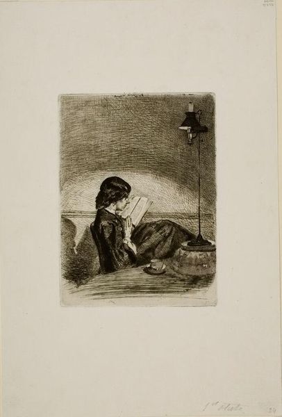 Editor: Here we have Marcellin Desboutin's portrait of Nina de Villard, seemingly without a precise date. It’s an etching, and the lines create such a delicate, almost fragile mood. What strikes you about the composition? Curator: Note the economy of line, its deliberate orchestration. The figure is not merely represented, but constructed through a series of calculated marks. How does the hatching around her face and costume define form and texture without resorting to facile realism? Editor: It’s like he’s suggesting detail rather than stating it outright, especially with the fur. What does that imply? Curator: Precisely. It invites the viewer to participate, to complete the image mentally. Consider the negative space too - it serves not as mere background, but as a vital element that shapes our perception. Editor: I see what you mean. The restraint almost amplifies the emotional weight of the piece. Curator: Indeed. The lack of color directs our attention to the fundamental elements of form and line, enriching the overall aesthetic experience.
