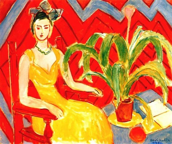 Editor: This is "Spanish Woman with Flowers," an oil painting by Henri Matisse. It feels like the whole scene shimmers with yellow light, from the background to the flowers. How do you interpret this piece? Curator: Let us observe first. Notice how Matisse employs flattened perspectives and vibrant color juxtapositions, characteristic of Fauvism. The background pattern competes with the woman’s shawl. Do you see how the textures and patterns interact? Editor: Yes, it almost feels like they are one and the same; they push forward visually instead of receding, the effect feels more like a mosaic of different shapes, not real depth. Curator: Precisely. Consider also the treatment of form. There is a simplification and stylization here. Look closely at how the brushstrokes build shape and texture; each one reinforces the two-dimensionality of the surface, but at the same time defines objects. Editor: It’s interesting to see the shapes that seem to lack a hard border between colors. I wonder what we could extract from this choice? Curator: He favors a composition led by colors instead of shapes or subject. Notice how the arrangement of these chromatic masses impacts your gaze; it pulls it towards the sitter and her elegant attire. What might we suggest in terms of the internal relations of his compositional elements? Editor: I am now starting to look at it as this kind of puzzle of colors. I appreciate how focusing on these intrinsic aspects helps me understand the artwork's effect, not just what it depicts. Curator: Indeed, it allows one to move past narrative into the mechanics of visuality.