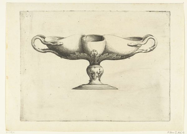 Hendrik van der Borcht the Younger etched this shell-shaped bowl supported by a duck. The shell, since antiquity, has been linked to Venus, born from the sea’s foam. It is a symbol of love, fertility, and the soul's journey. This echoes in Botticelli's "Birth of Venus," where she arrives on a giant scallop, reborn and radiant. Here, it is presented as a man-made object, a vessel, rather than a natural phenomenon. It suggests a containing, protecting, or even concealing function. The duck, steadfast and ever-watchful, supporting the shell, might evoke vigilance and guardianship. This motif has roots stretching back to ancient Egyptian symbolism, where birds often represented the soul. Placed in this context, it suggests a vessel for spiritual or emotional content. Perhaps, as you gaze upon this bowl, consider how symbols speak to the collective unconscious, weaving narratives across time and cultures.