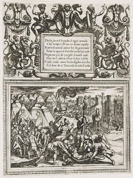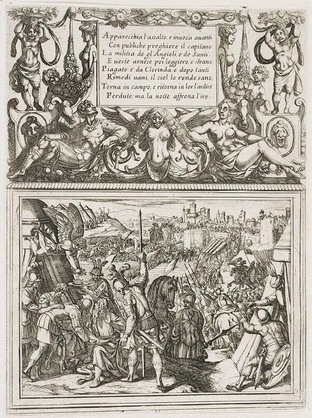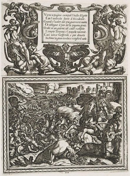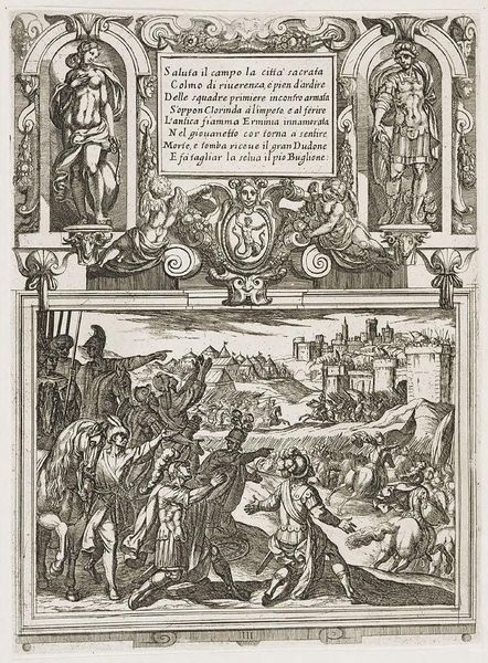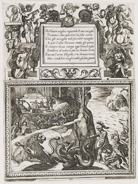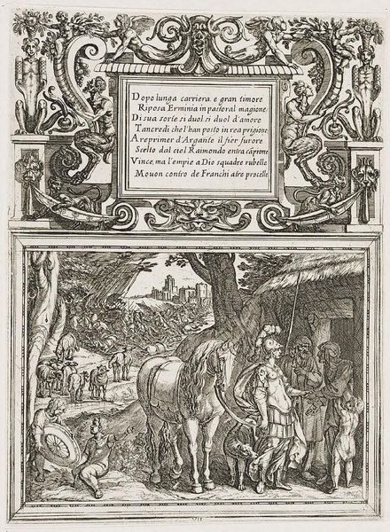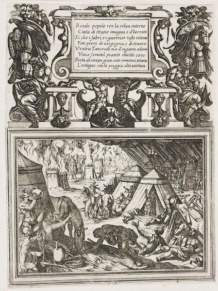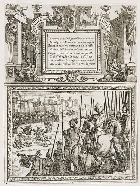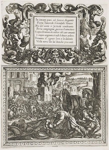 Curator: Antonio Tempesta created this "Illustration for Canto IV," and I'm immediately struck by its intense, almost chaotic energy. Editor: Indeed. The composition, with its dense cross-hatching, creates a dramatic contrast of light and shadow, heightening the scene's tension. Curator: Consider the centaurs and mythical beasts that frame the text. These hybrid creatures signify the melding of reason and instinct, a common theme in epic poetry. It speaks to the internal struggles of the characters. Editor: The etching technique, with its reliance on line, dictates the forms, almost flattening them against the picture plane. This compression amplifies the sense of a world teeming with conflict. Curator: The text itself, inscribed in Italian, is like an ancient inscription, adding to the timeless quality of the artwork. It reminds us that these myths continue to resonate with us. Editor: I find the stark contrast quite evocative; the starkness emphasizes the narrative's brutal nature. It's a very physical, very immediate experience. Curator: Ultimately, it shows how symbols can capture the collective memory. Editor: A powerful piece of visual storytelling, indeed.
