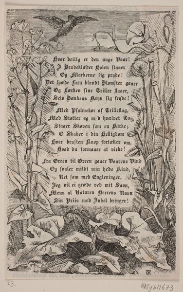 This print, made by H. C. Henneberg, features an angel, a cross, and a skull framing a piece of text. Without a date we can only suggest it was made sometime in the 19th Century, in Denmark. The image creates meaning through the use of Christian and secular visual codes. The cross and angel's head are references to the religious culture of the time, while the skull is a symbol of death. These images are placed on a background of dense text. Given the social context of 19th-century Denmark, this print may have been made for private devotion, with its overt religious symbolism typical of the period. The inclusion of the skull reminds us of the ever-present nature of death. The fact that it is printed, suggests this was made for a wider audience than a painting, but we can only speculate on what that audience was. To truly understand this piece better, further research into Danish print culture and religious practices of the 19th century would be necessary.
