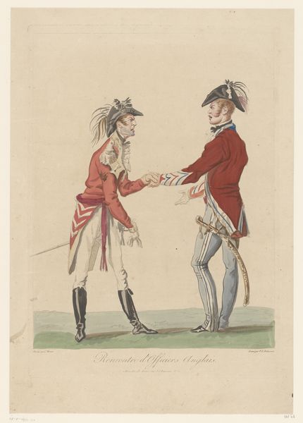 Editor: So, this is James Gillray's "Pylades and Orestes," created in 1797. It looks like a colored print or drawing, and the figures are certainly...memorable. Their features are so exaggerated! How do you interpret this work? Curator: This print, indeed, seizes your attention, doesn't it? Beyond the immediate caricature, consider the title. Pylades and Orestes – symbols of devoted friendship from Greek tragedy. Gillray cleverly grafts that classical ideal onto, perhaps, a less-than-ideal reality. Who might these figures represent, and what "friendship" is being satirized here? Editor: I see! So, it's not just a funny drawing. The title adds a layer of meaning, implying a critique of someone's relationship. The one in blue is so puffed up! Curator: Precisely. Caricature isn't merely distortion; it's revelation. Think of the clothing, the body language. What societal types might these figures represent, and how does Gillray use their appearance to comment on their power or status? Are these characters truly embodying their title’s namesakes? Editor: Well, the guy in blue looks quite wealthy and pompous. And the other one seems much weaker, relying on him for support... It definitely undermines any sense of heroic friendship. Curator: Observe how Gillray uses scale and proximity. The smaller figure literally leans on the larger, almost consumed by him. Is this a true partnership, or something more parasitic? How might Gillray be playing on the political or social climate of his time to make his point? Editor: That’s fascinating. I never would have looked that closely at all the… symbols. Curator: Gillray was a master of visual language. And it continues to engage viewers today, doesn’t it? We project ourselves, our understandings of relationships and power dynamics, onto these enduring images. Editor: I get it! Now I see how this caricature transcends the surface, telling an entirely different story through cultural reference and symbol. Curator: And remember, these interpretations continue to shift. Art allows each new viewer a fresh engagement!