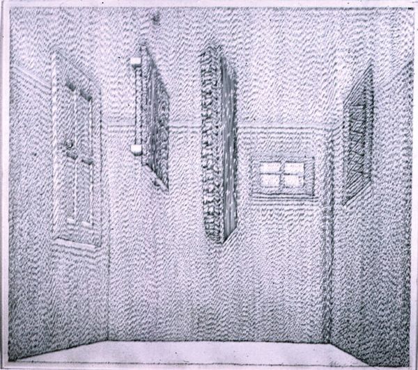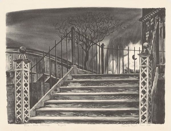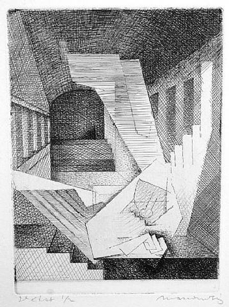 Curator: Immediately, it gives me this sense of almost being trapped. Or, like, at a crossroads that's both inviting and ominous. Is that just me? Editor: No, not at all. The mood is definitely complex. What we're looking at is "Planches de Salut," an etching by Louis Marcoussis, made in 1931. And the title, translated, means "Plans of Salvation" or "Safety Planks." Curator: Plans of Salvation…so there's a doorway, stairs leading up, right? And everything is rendered in these really precise, almost mathematical lines. It reminds me a bit of Piranesi, all those Escher-esque spaces. What does "salvation" even look like here? Editor: I think that ambiguity is intentional. Marcoussis, though associated with Cubism, incorporates architectural elements here that certainly speak to the broader societal anxieties of the interwar period. The staircase, that could be ascension, but also escape… Curator: Escape from what, though? Look at the hatching—that obsessive darkness around the figure near the doorway and framing the staircase, is like encroaching doom. This figure seems like it's trapped in shadow. It could either find salvation by stepping away, through the door, or by proceeding into this inky stairway…Or maybe its trapped as a result of a previous choice! Gosh this work is loaded with questions! Editor: And isn’t that figure’s stoic isolation also a reflection of the existential themes prevalent in literature and art then? Remember this is just a few years removed from The Great Depression. Maybe salvation isn’t an individual climb, but a collective one. Curator: Yes, and look at how stark the door and stairwell feel when juxtaposed against the obsessive pattern surrounding this isolated figure and room! A lot to digest...almost unnerving that the way to salvation feels so alien and removed! Editor: This print is fascinating because of those layered readings it invites. Beyond just formal considerations of line and space, Marcoussis captures something profoundly human about seeking a way forward in uncertain times. Curator: It’s definitely unsettling. Almost too austere to give one a clear read. More than ever, I'm eager to spend a few extra minutes with this one. Thanks for walking me through!