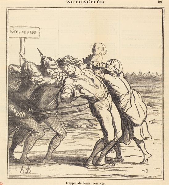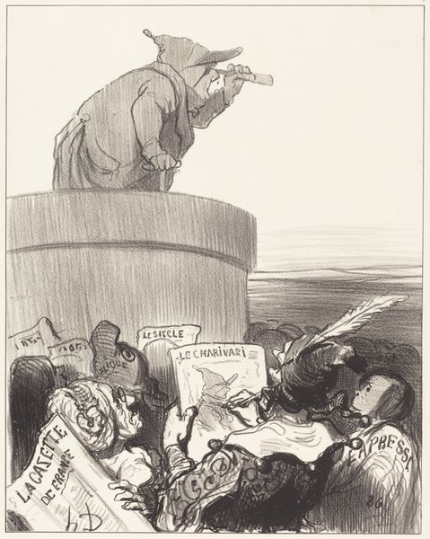 Curator: Daumier's lithograph, "Déjà relevée!", made in 1871, depicts a potent scene of post-Franco-Prussian War France. There’s a starkness to the greyscale lithography, isn't there? The immediate feeling is bleak. Editor: Indeed, the high contrast emphasizes the weight of the historical moment. But tell me more about Daumier's method of production at the time? What sort of tools and workshops would he have been employing? Curator: Daumier, prolific as ever, worked quickly to produce images for publications like “Actualités.” The process involves drawing on lithographic stone, which is then treated with chemicals, inked, and printed. This method enabled a mass production of imagery that was vital for social commentary, allowing his art to rapidly circulate and directly engage with contemporary issues. Editor: Which is deeply relevant. What social critiques does it offer, do you think? Because, to me, this lithograph reads as a commentary on the burden of war debt. You see France, personified by a statuesque figure of a woman, leaning on a large sphere labeled "Emprunt" – Loan. Below her are caricatured figures, clearly representing the French populace, looking up with a mixture of anxiety and resignation. It’s incredibly sobering, really emphasizing the unequal impact war had on all classes. Curator: Precisely. Consider also that printmaking during this period also became a vital, sometimes subversive, form of artistic and political expression during periods of intense state censorship in France. Lithographs are fascinating historical artifacts documenting both a nation's and individual's struggles. But, in relation to these people represented, what roles do they assume in the process of production itself? How is the art consumed and distributed among them? Editor: Yes, excellent point! And here, Daumier is definitely implicating those masses into an awareness of the mechanisms and financial implications of defeat and recovery. There is also a great commentary on gender, right? The representation of France as feminine and burdened reinforces patriarchal notions of nationhood while simultaneously critiquing the weight placed upon the country. Curator: Looking at it this way provides some context for thinking of the distribution process too—to better comprehend how many lithographs were consumed. Perhaps now the labor behind such works can be brought to light as well. Editor: It reminds us that art isn’t just a beautiful object, but a historical document shaped by production methods, shaped by the politics, anxieties, and hopes of its time. A truly sobering reminder that we must continue questioning these power structures even now.