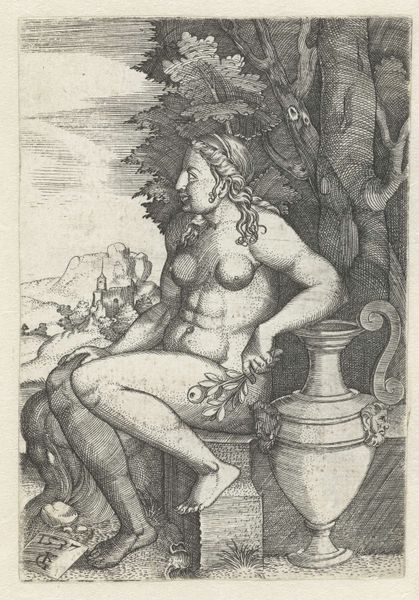 This engraving, "Seated nude next to a vase" was created around 1550 by the artist known only as Master FG. The composition is tightly organized within the small sheet, dominated by the figure and the prominent vase beside her. The artist uses dense, cross-hatched lines to create a rich texture and a stark contrast between light and shadow. The nude figure, with its somewhat exaggerated musculature, and the ornate vase, challenge traditional ideals of beauty. The figure is rendered with meticulous detail, highlighting the play of light and shadow across the skin, while the vase is adorned with grotesque masks, destabilizing established categories of aesthetics. Note how the artist's graphic style creates an interplay of visual elements and intellectual ideas. The formal qualities of line and texture function not just aesthetically but also as part of a larger cultural discourse about beauty and representation.