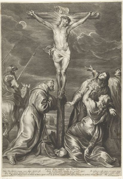 Agostino Carracci rendered this engraving, ‘Christ on the cross’ with immense skill. The cross is the central symbol here, a potent emblem of sacrifice rooted deeply in Christian theology, representing not just physical suffering but spiritual redemption. The fainting Virgin Mary, supported by compassionate women, echoes classical motifs of grief and mourning seen in ancient sculptures and Roman sarcophagi. Mary's collapse and the supporting figures find parallels in depictions of mourning figures from antiquity, symbolizing overwhelming grief. This motif predates Christianity, appearing in ancient Greek and Roman art. The enduring image of the Mater Dolorosa — the sorrowful mother — resonates across centuries, stirring collective memories of loss and empathy. These symbols speak to shared human experiences and engage viewers on a profound, subconscious level. The cross and the grieving mother have resurfaced, evolved, and taken on new meanings in different historical contexts.
