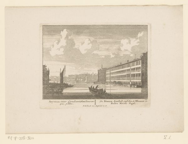 Editor: So, this is Jan Smit's engraving, "View of the Binnen-Amstel and the Diaconieweeshuis in Amsterdam," from around 1700 to 1748. The level of detail is just incredible for a print! It really captures a peaceful day on the canal, but there's also something a bit… austere about it. What's your take on this piece? Curator: Well, this image provides us with a fascinating lens through which to view 18th-century Amsterdam. This isn’t just a pretty picture; it’s a document embedded within the social and economic fabric of the Dutch Golden Age. Think about the prominence of the Diaconieweeshuis, the orphanage. What does it say about the city that this institution, a vital component of its social welfare system, is featured so prominently in the cityscape? Editor: That’s a good point. I was so focused on the composition that I didn’t really consider its role. Curator: Consider how prints like this one, affordable and relatively easy to reproduce, helped shape and disseminate ideas about Amsterdam itself. These images functioned almost as propaganda, shaping a civic identity, and influencing tourism by celebrating the city's organized affluence. What are your thoughts on its role as a public image? Editor: Hmm, a form of advertisement, I suppose. So it's presenting a carefully crafted picture to the outside world? Curator: Precisely! Smit is showcasing Amsterdam’s societal structure through its architectural landmarks. These serene images conceal the social dynamics at play in Amsterdam’s culture, as does most commercial marketing of place. How has your interpretation changed? Editor: I'm now aware that this print goes beyond simply representing the city as a place. I can appreciate the historical narrative being told. Thanks! Curator: And I’m reminded of how easy it is to overlook the social function of even the most seemingly benign art. It's a worthwhile point that many may miss!
