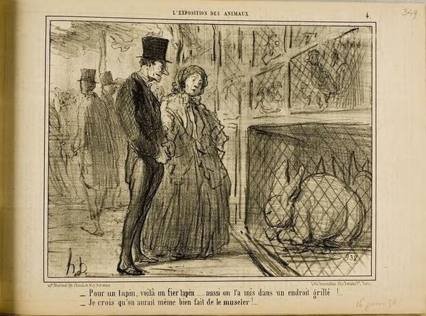 Curator: This lithograph by Honoré Daumier is titled "The beef-elephant, a very useful new variety..." It's part of a series critiquing the social and political climate of 19th-century France. The scene depicts onlookers gazing at a bizarre, imagined creature. What strikes you first? Editor: Immediately, the elongated, almost grotesque features of the onlookers grab my attention. Their exaggerated expressions of awe hint at a deeper societal commentary. Curator: Precisely. Daumier uses caricature to critique the bourgeoisie’s obsession with novelty and status. The "beef-elephant," likely a symbol of capitalist excess, becomes the object of their desire. The text below satirizes the stock market speculation of the era. Editor: The elephant-ox hybrid itself seems to embody conflicting cultural symbols – strength and exoticism, mixed with domesticity and commerce. An almost monstrous symbol of potential. Curator: Yes, and through this image, Daumier is speaking to issues of class, consumerism, and the rapidly changing social fabric of his time. Editor: It's a potent reminder that our fascination with newness often masks deeper social inequalities. Curator: Indeed, a work that continues to resonate today.