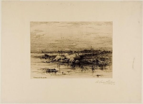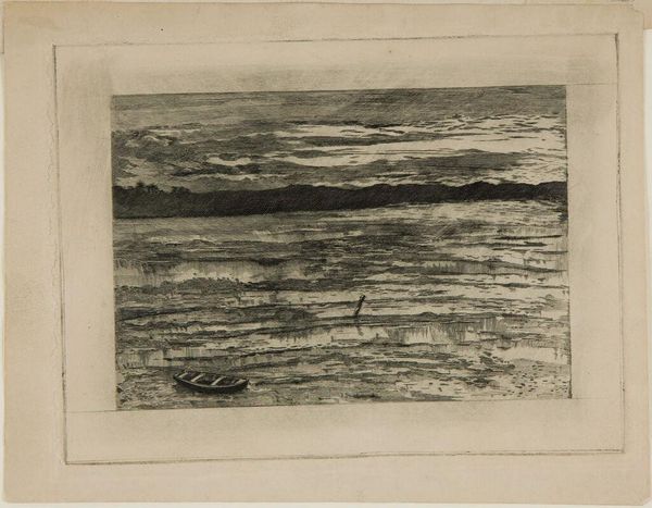 Editor: Here we have William Fowler Hopson's "Seascape," held at the Harvard Art Museums. It’s a captivating etching, quite small and intimate, almost like a private meditation on the sea. What strikes you about it? Curator: The etching technique itself is key. Consider the labor involved in creating these lines, the physical act of engraving the plate to produce this image. This wasn't just about depicting a landscape; it was about engaging with a specific industrial process. Editor: That's fascinating. So, seeing the marks as evidence of production changes how we view the image? Curator: Exactly! It encourages us to consider the social and economic context of artmaking. Hopson's choice of etching, a relatively accessible printmaking method, speaks to a wider shift in art production and consumption during his time. Thinking about the labor and materials, we get a much richer understanding. Editor: I never considered that. Thanks, I'll never look at an etching the same way.
