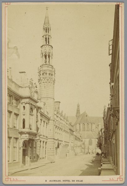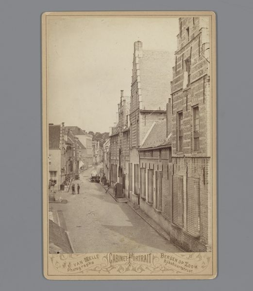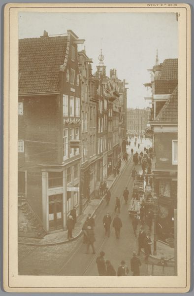 Curator: Let's discuss this image titled "Gezicht op de Obernstrasse in Bremen," a photograph created by Louis Oskar Grienwaldt around 1890. What strikes you first? Editor: A strong sense of nostalgia. The sepia tone immediately transports you. It's a seemingly ordinary street scene, yet the photograph elevates it into something evocative, like a faded memory of a bustling past. Curator: Precisely. Note how Grienwaldt employs pictorialism. The slightly soft focus and tonal range give the image an artistic quality, blurring the line between photography and painting. Observe how the verticality of the buildings is masterfully mirrored in the elongated tower. Editor: That tower pulls the eye upwards, towards the heavens. But it’s also about aspiration. The cityscape is a testament to human ambition, with each brick and stone laden with historical weight. One can almost feel the echoes of generations of people. Curator: A careful examination of the street reveals an interesting interplay of lines. The tram tracks in the center ground draw your eyes through to the tower; there is a constant vanishing point. And look at how people and carriages disrupt the formal lines of the architecture, a controlled asymmetry in play. Editor: The carriages! They speak of transit, of trade, and the passage of time. The street becomes a stage where countless dramas have unfolded. The buildings function almost as masks of the inhabitants of this town – solemn yet containing entire worlds of private, personal narratives. Curator: I concur, yet I also must observe the geometrical rigor Grienwaldt displays. His skillful framing balances formal constraint with narrative possibility. Even in a snapshot of modern life there is careful orchestration of planes in relief. Editor: But is it "modern life"? It feels dreamlike – timeless in a way that reveals the deeper longings for place and belonging encoded in these ancient towns. Ultimately, it triggers that very human yearning for connection with a world rapidly receding into history. Curator: An excellent reading! It appears we agree that both structure and cultural meanings can peacefully coincide in analyzing this photographic image. Editor: Yes, structure provides us with one narrative entry into cultural awareness.