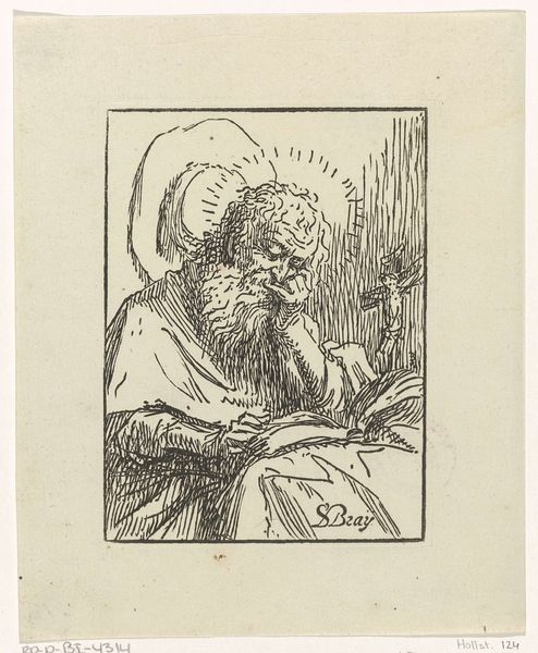 Curator: This is "Hermit St. Macarius of Egypt," a pencil drawing from the 17th century, attributed to Harmen ter Borch, currently held here at the Rijksmuseum. Editor: There's a quiet drama in the sketch. The way the pencil describes the heavy drapery creates a cloistered, almost oppressive space around the figure. What strikes you first? Curator: The figure's obscured face is what draws me in, as this compels me to think about historical interpretations around monasticism and sainthood, and its role as a potential rejection of worldly structures like family and gendered relations for women and men alike. Editor: Yes, it's the posture that speaks most loudly, isn't it? That hunched, inward turn communicates a profound contemplation. See how Ter Borch uses shading to deepen the sense of interiority and humility. The contrast almost seems to push the figure further away from our grasp. Curator: Absolutely. Looking closer, the simplicity of the medium speaks volumes. The use of pencil emphasizes that these historical individuals existed in society as common figures, with humble beginnings before assuming leadership and saintly roles later on in life. The starkness serves as a reminder of the very earthly reality from which spirituality blossoms. Editor: And that simple book! So plainly drawn but full of meaning. Perhaps it’s meant to denote scripture or classical texts; notice how its sharp lines contrast with the softer shading of the drapery. Curator: The placement of that book, next to the figure, signifies an entire philosophical anchor for this way of life in ancient and early medieval society. You can really infer its influence on monastic and ascetic values of learning that still echo today. Editor: What an evocative exploration of both form and context! Curator: Precisely, art allows us to think through individual and shared experience. This Baroque-style drawing does an amazing job to allow us a glimpse into past, and still relevant social dynamics, and what they represent for the present.