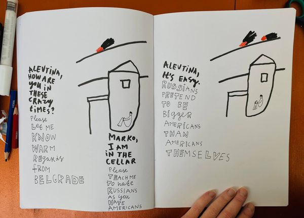 Alevtyna Kakhidze made this drawing in 2022 using what looks like pen on paper. It’s raw, immediate, like a page torn from a diary, full of thoughts spilling out. There’s text in Russian alongside an image of a rabbit emerging from a top hat. The lines are shaky, unrefined, and this gives the image a certain vulnerability. It’s like we're seeing the artist think, directly onto the page. The rabbit, drawn with such simple, almost childlike strokes, becomes a powerful symbol. Note the direct, emotive statement written in English. This piece reminds me a little of the work of Philip Guston, in that he also embraced a kind of intentionally clumsy, honest mark-making. And like Guston, Kakhidze uses this directness to communicate something profound. It's a reminder that art doesn't always have to be polished to be powerful; sometimes, it's the rawness that makes it resonate. It's about the exchange of ideas, a conversation across time and space.