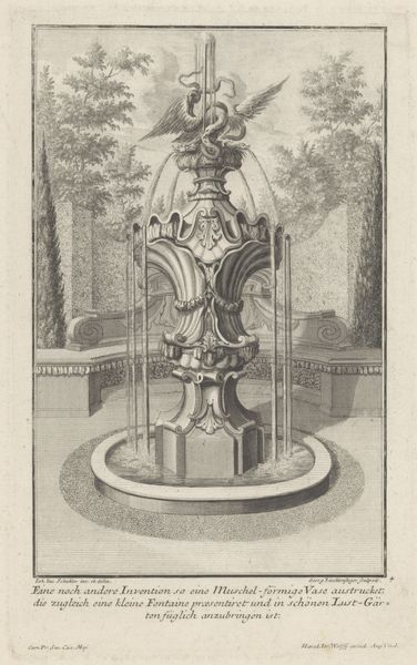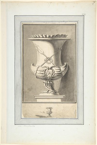 Curator: This engraving, entitled "Vaas met drietanden", which translates to Vase with Tridents, was created between 1729 and 1737. Gabriel Huquier is the artist and you can find this print in the Rijksmuseum's collection. Editor: It has an air of solemn, stylized grandeur. The level of detail is astounding, the texture rendered solely through these intricate lines! The overall impact is quite impressive despite the limited grayscale palette. Curator: Considering the decorative-art context of its Baroque style, think of the possible lives this engraving would have lived! How might it have circulated through various hands and spaces, perhaps reproduced for a broader audience? The symbolism also evokes potent questions, not just in what the vase *represents* but for *whom* and toward what end? Editor: The engraving process itself is crucial. The creation of multiple identical copies was labor-intensive, requiring meticulous hand work and the use of metal plates to transfer the image. These methods allowed for the democratization of design. I’d be curious to know about the tools and labor of this engraver. Curator: Agreed, we should dive more deeply into the lives and possible politics of those making this image, or what they had in mind as potential consumer fantasies about wealth. Thinking of decorative vases from our contemporary lens, and their continued associations with luxury and status. This is just as valid as pondering its past reception. Editor: Right, and while those high associations were certainly baked in at the time, engravings were produced in multiples and circulated beyond the upper classes. Their purpose was for consumption, to fill homes, decorate walls and furniture, and display design ideas! They became the very seeds from which further making sprang. Curator: Well said. Contemplating it, my gaze drifts back and forth across the trident symbols, landing on that somewhat comical face embedded within the shells that form the base. Editor: Yes! And my eye returns to those shells too. Once living organisms now rendered stone. The way Huquier meticulously captures that surface makes the art truly alive. Curator: A final thought for me would be tracing the vase's transition—from conceptual form, through production in varied media, to becoming a cultural symbol that resonates today. Editor: Indeed. A great look at the piece.