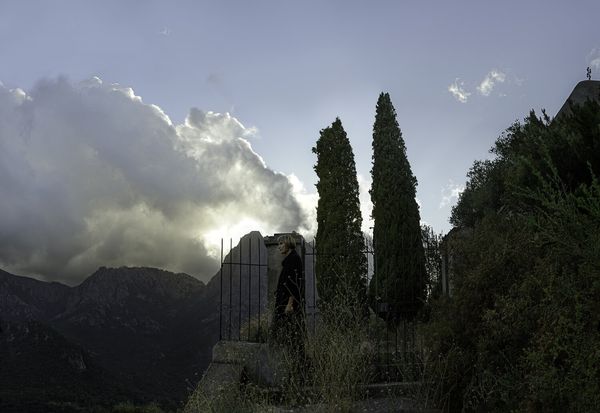 Elina Brotherus created “Tombeau Imaginaire 7,” where a lone figure, back to the camera, gazes out over an expansive mountainous landscape. This image prompts us to consider the intersection of individual identity and the natural world. Brotherus, emerging in the late 1990s, places herself within a lineage of female artists exploring themes of identity and representation. Her work often features women in contemplative poses, inviting introspection on the female experience. Here, the figure's dark clothing and solitary stance evoke a sense of melancholy, reminiscent of Romantic landscape paintings that positioned the individual against the sublime power of nature. The title, “Imaginary Tomb,” adds another layer, suggesting a meditation on loss and memory. The image moves beyond traditional representations by focusing on personal and emotional dimensions, inviting viewers to reflect on their own place within the vastness of the world and the complexities of memory. How do we shape, and how are we shaped by the landscapes we inhabit, both physically and emotionally?